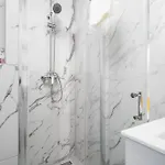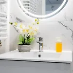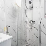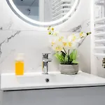 وهي مزودة بأرضيات مبلّطة. ويشتمل الحمام أيضًا على مجفف الشعر وملاءات الحمام والمناشف.